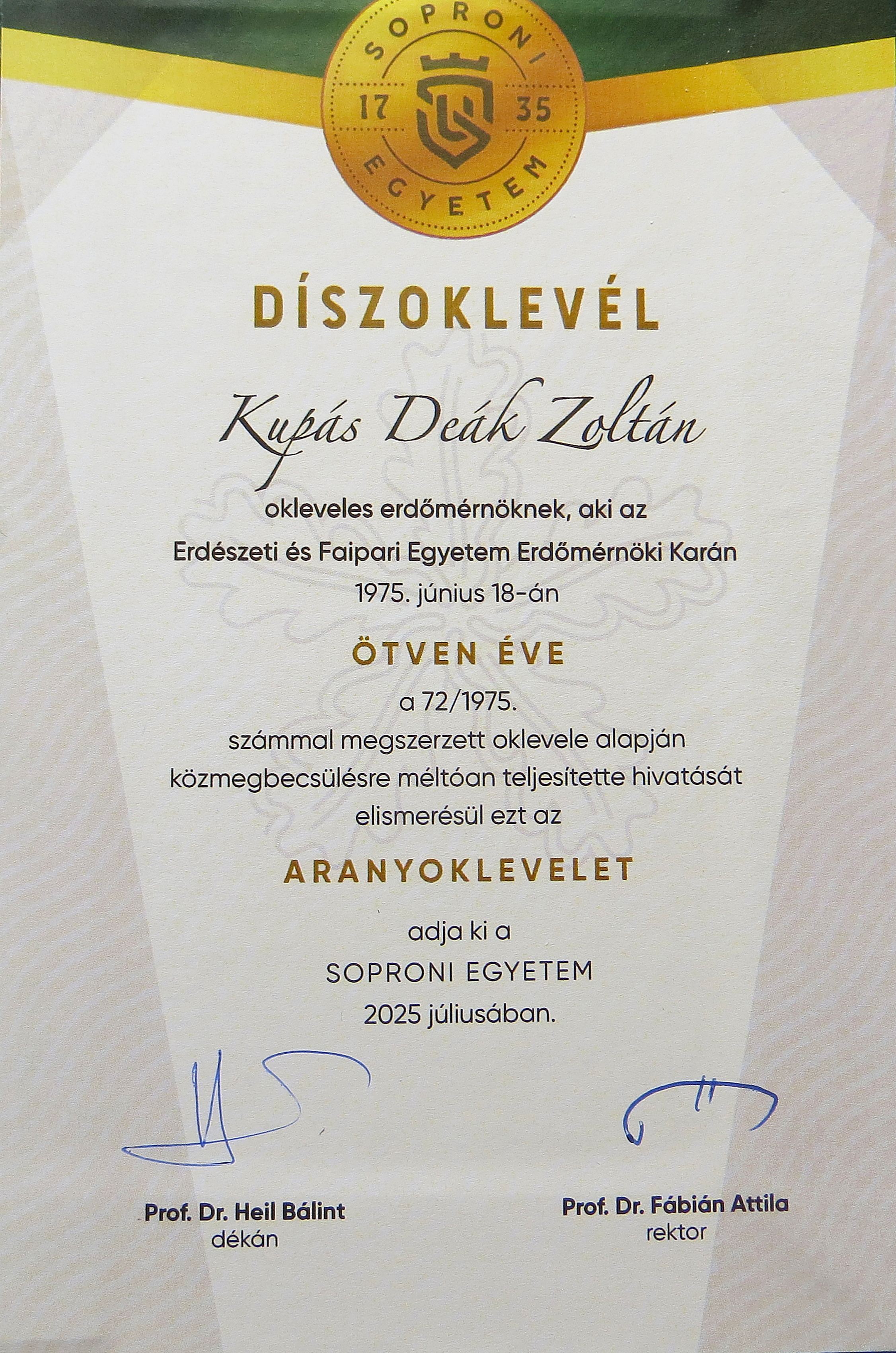 Az Aranyoklevélhez szívből gratulálunk Kupás Deák Zoltán aranydiplomás erdőmérnöknek és ez alkalommal is jó egészséget, boldogságot kívánunk a Gyulaj Erdészeti és Vadászati Zrt. egész közössége, aktív- és nyugdíjas munkatársai, üzleti partnerei, vállalkozói, a Gyulaj Zrt. leányvállalatai, a részvénytársaságunk szimpatizánsai, és a cég munkájának és tevékenységének lelkes vármegyei, országos és nemzetközi szurkolói, drukkerei nevében!