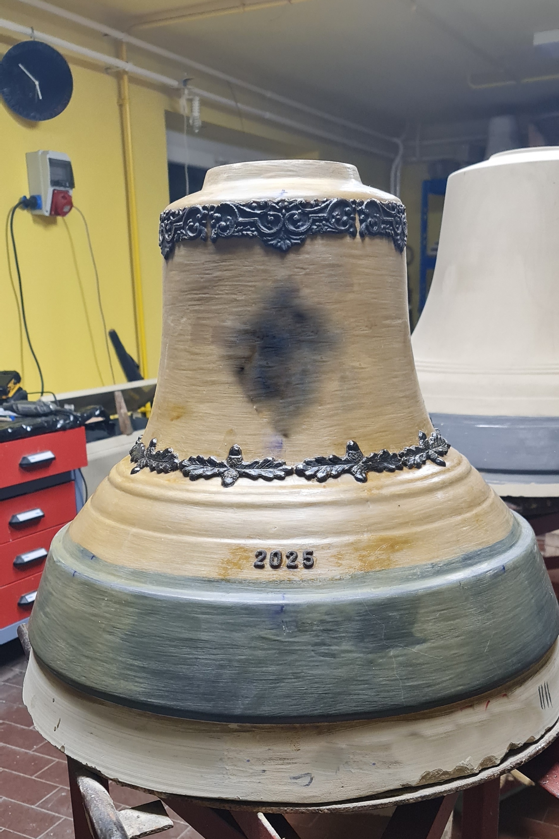 A harangöntő mesternél, a Tamásiba készülő harang folyamatban lévő munkálatai során készült öntőforma fotók közül kiválasztottunk egyet, melyen a harang-öntőformán az öntési motívumot jelenleg még elhomályosítottuk (legyen ez majd meglepetés).
