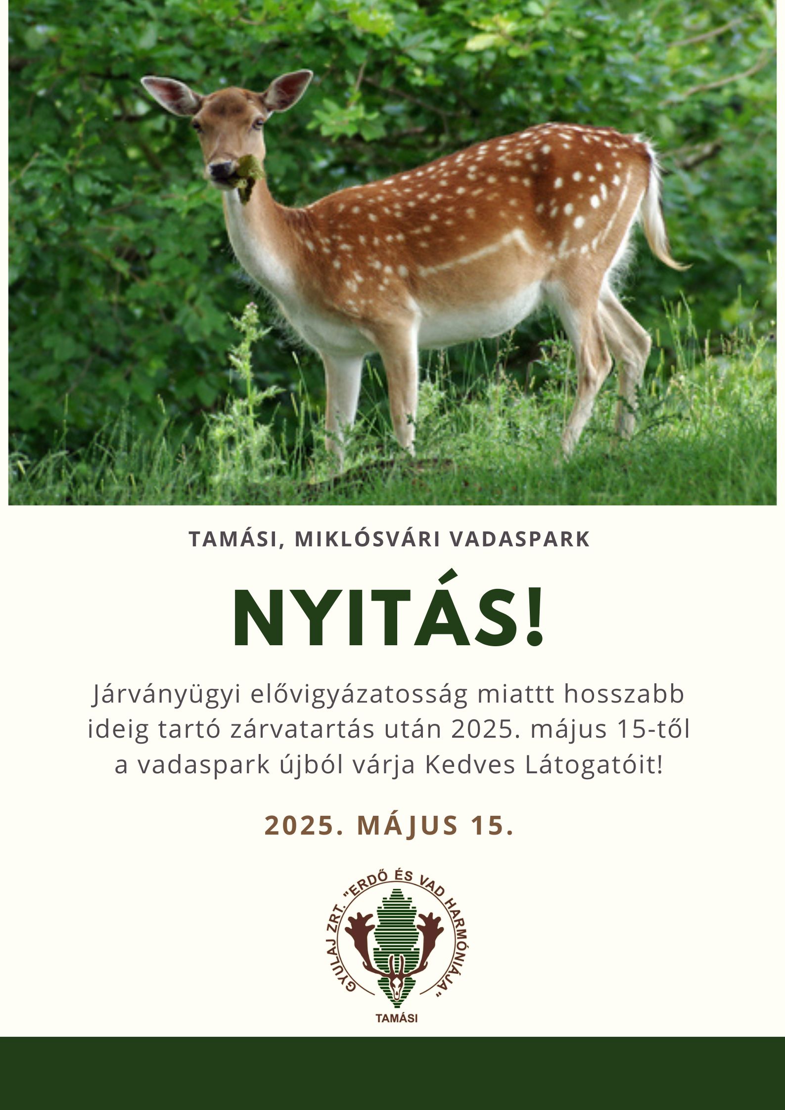 Örömmel tájékoztatjuk Kedves Látogatóinkat, hogy a Tamási, Miklósvári Vadaspark 2025. május 15-től, csütörtöktől újból látogatható! Bár a vadaspark - állategészségügyi, elővigyázatossági okokból- sokáig zárva tartott, a munka nem állt meg odabent. Kihasználva a kényszerű leállást, a vadasparkban található mindkét leskunyhón teljes tetőcserét hajtottunk végre, így a park lakói megújult kunyhókból figyelhetőek meg természetes, erdei környezetükben. Az újonnan kihelyezett nyalósó helyek reményeink szerint még több vad észlelést biztosítanak majd a vadat megfigyelni kívánó látogatóiknak! Szeretettel várjuk régi és új látogatóinkat!